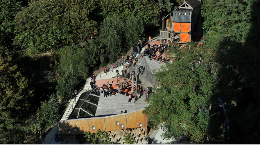 Bereits 2008 wurde dieser originelle Kinderspielplatz in Paris auf der Höhe des Belleville Hügels fertiggestellt. Zuvor gab es Workshops mit Kindern und Eltern, deren Wünsche sind in die Konzeption des Kinderspielplatzes mit eingeflossen. Umgesetzt wurde dieses Projekt von BASE, Auftraggeber war die Stadt Paris.