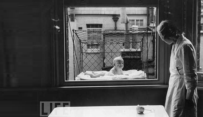3. Eine besonders spannende Erfindung aus den 30er Jahren. Der Babycage wird außerhalb eines Gebäudes angebracht und soll für mehr gesunde Frischluft für das Baby sorgen.
