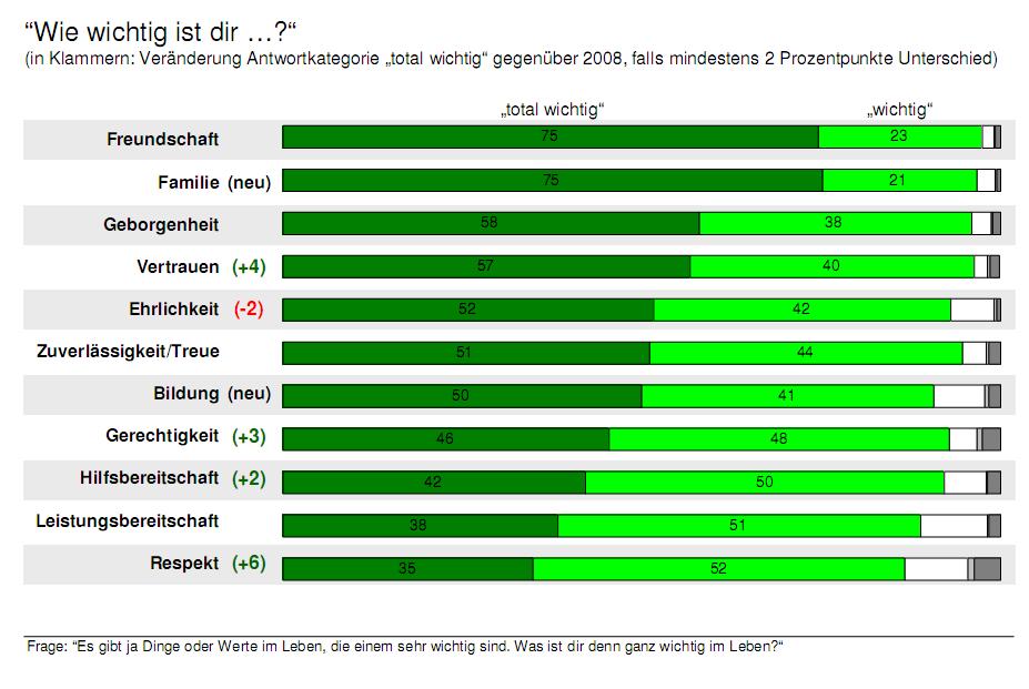 Gegenüber der vorhergehenden Befragung in 2008 hat aus Sicht der Kinder die Bedeutung von vielen Werten auf hohem Niveau noch einmal zugenommen. Am stärksten stieg aus ihrer Sicht die Wichtigkeit der Werte „Respekt“ (plus 6 Prozentpunkte auf 35 Prozent, die diesen Wert „total wichtig“ finden), „Vertrauen“ (+4 / auf 57 Prozent) und „Gerechtigkeit“ (+3 / auf 46 Prozent).