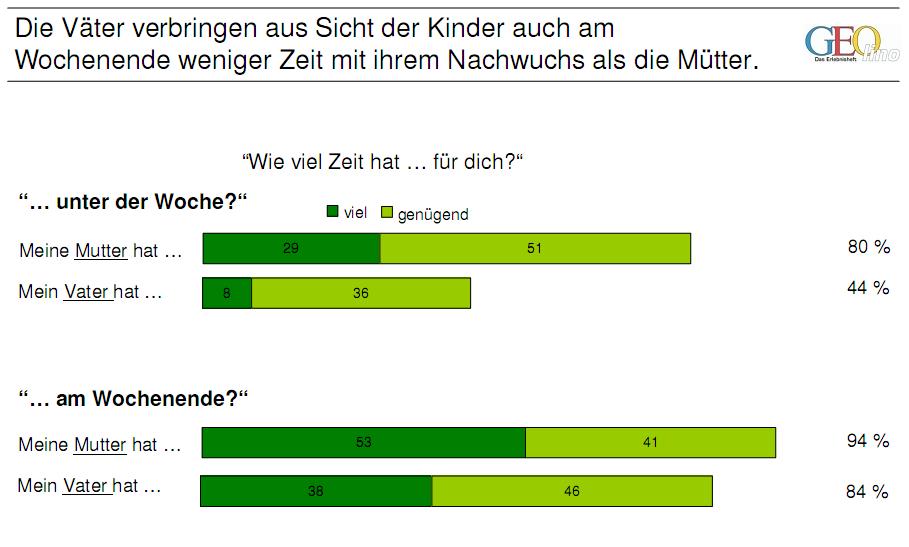 Aus Sicht der Kinder nehmen sich Mütter unter der Woche zu 80 Prozent „viel“ oder „genügend“ (29% / 51%) Zeit für ihre Kinder, Väter kommen dagegen nur auf 44 Prozent (8% / 36%). An den Wochenenden haben die Väter zwar zu 84 Prozent „viel“ oder „genügend“ (38% / 46%) Zeit für ihre Kinder, aber selbst dann erzielen die Mütter (94%) einen klar höheren Wert.